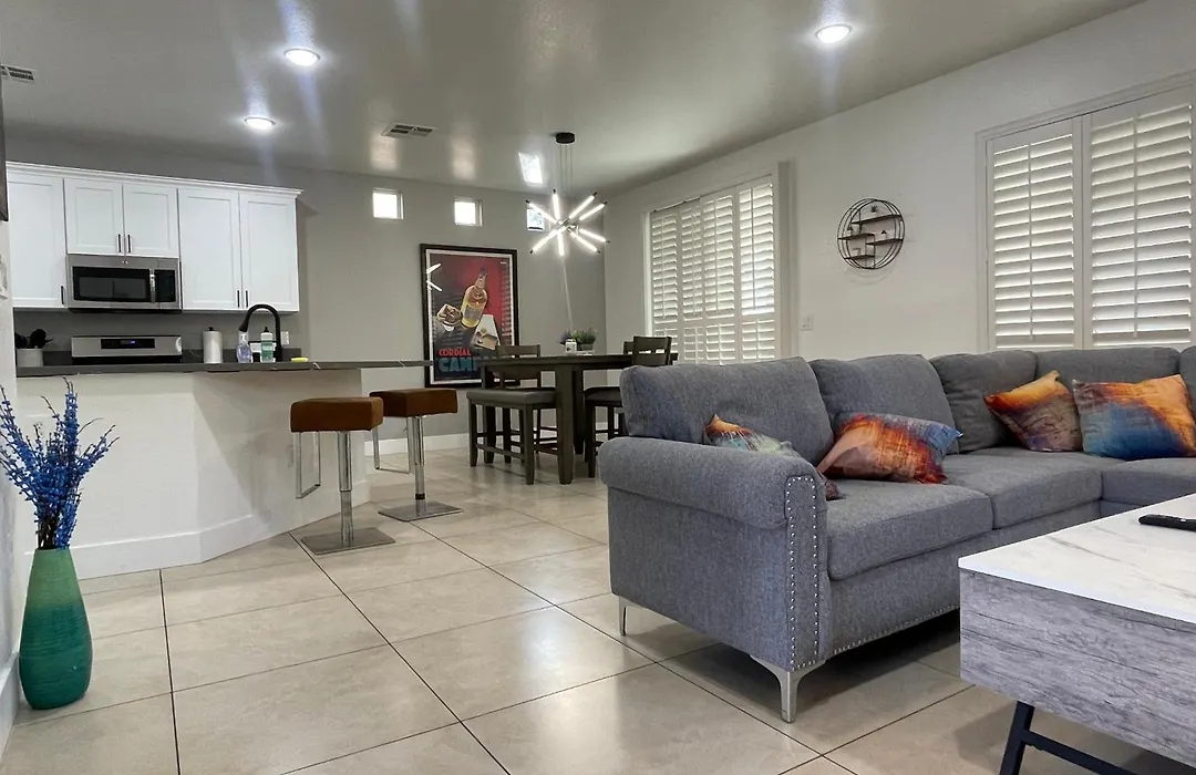 Perfect Lv Home - Gated & Quiet - 9Mins To Strip features an equipped kitchenette where guests can find an electric kettle, a fridge, and kitchenware. This Las Vegas accommodation is in the vicinity of restaurant Happy Wok.